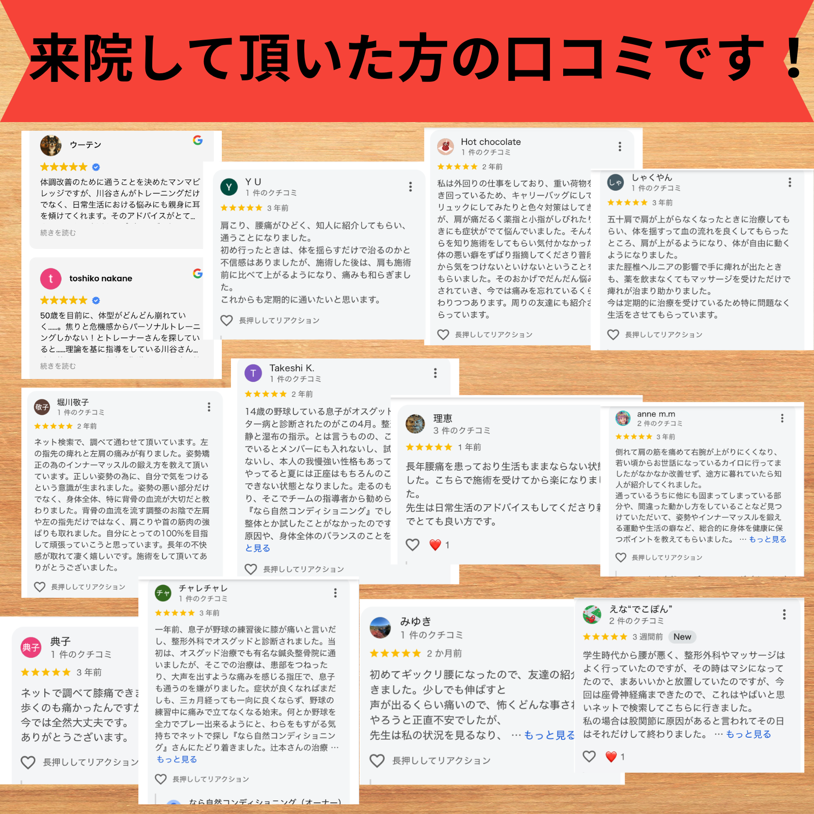 現在は、皆様のお陰でなら自然コンディショニングも地域ダントツ一番の施術院という自負と過信のもと、たくさんの方に支えられ成り立っています。