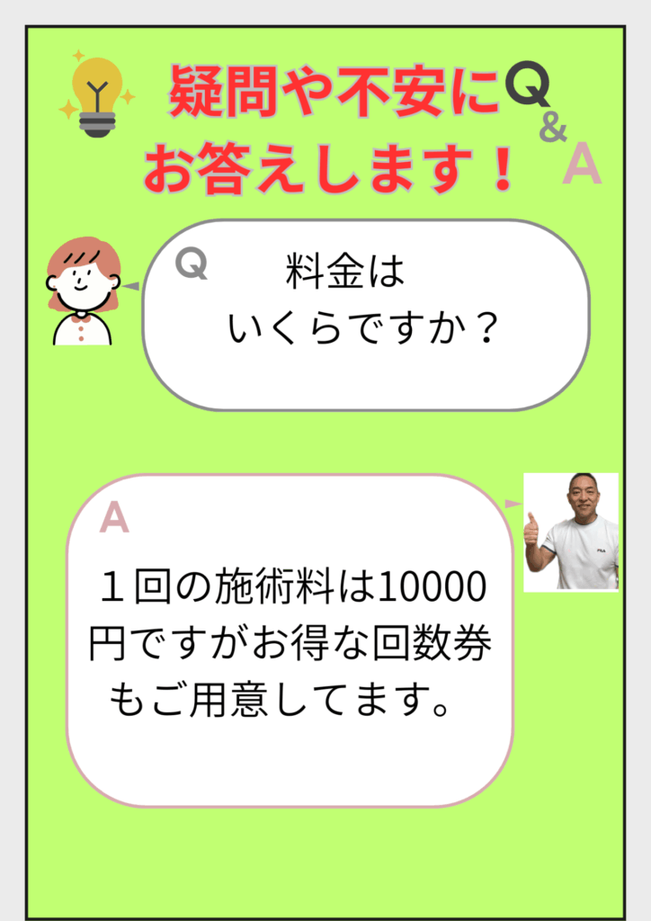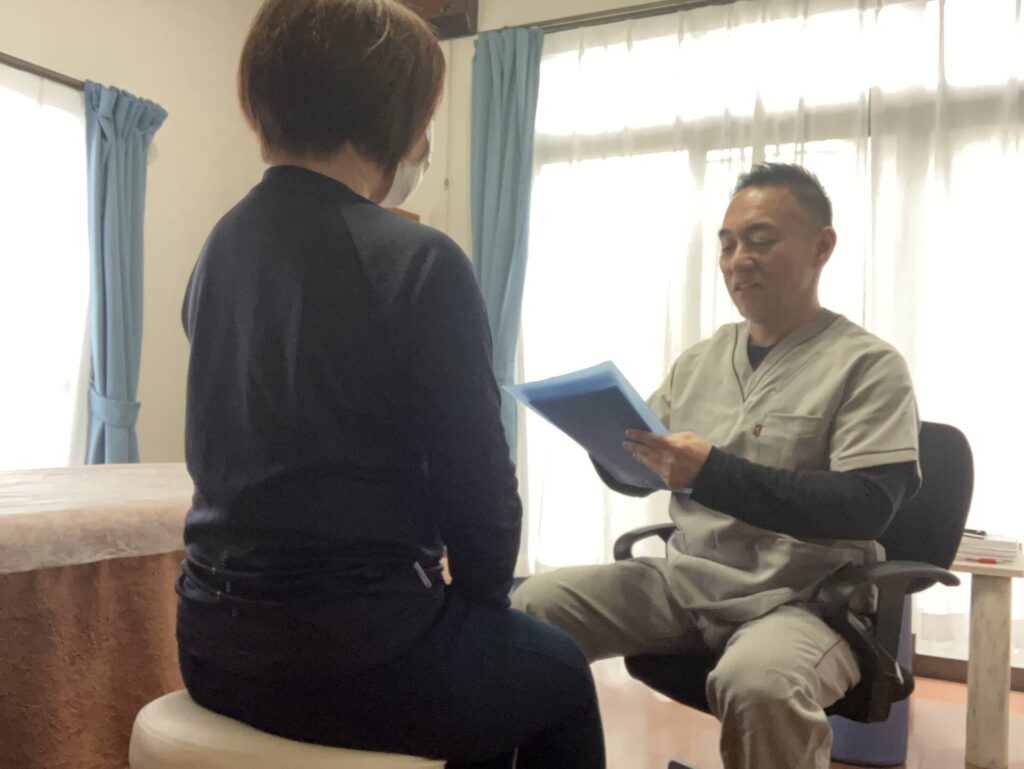 施術が終わったらおしまいではありません。必ず施術後の確認をします。その結果を参考に次回の来院の目安や、家での自己ケアなどのアドバイスをお伝えします。早く良くなる為には、自己療法はかかせません。二人三脚で、1日も早い改善を目指しましょう!
