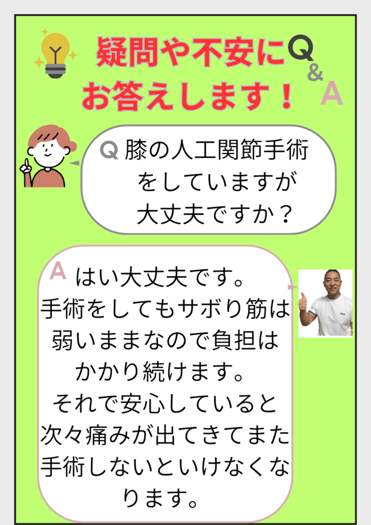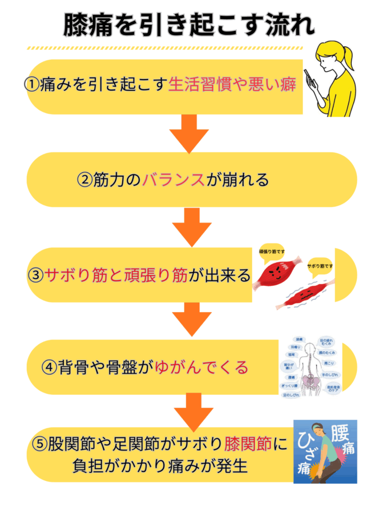 例えば、奥さんが(頑張り筋)でご主人さんが(サボり筋)だとします。ご主人さんは遊んでばかりで全く働かないので、奥さんはその分朝も夜も働き続けます。当然奥さんは倒れます、その状態があなたの膝です。